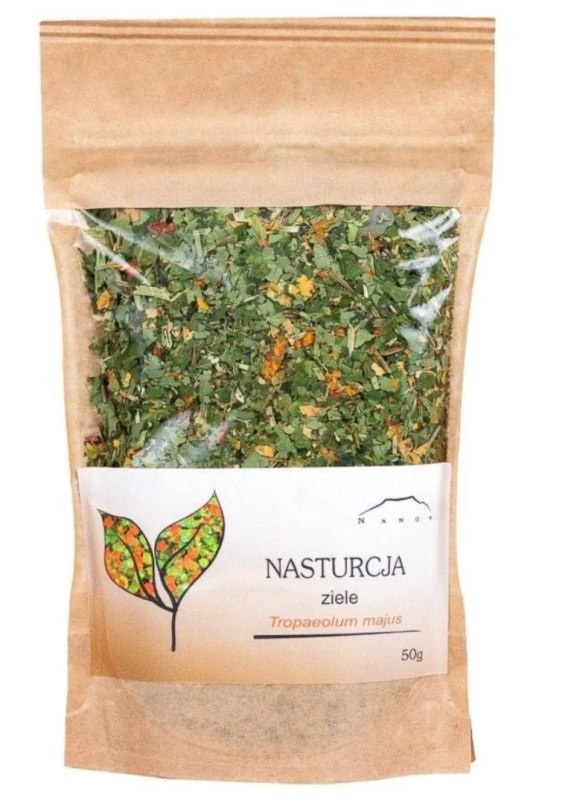 Nanga Nasturcja większa ziele cięte 50 g to suplement diety w formie ciętego suszu roślinnego zawierający ziele nasturcji większej, charakteryzujący się wysoką jakością surowca i starannym procesem cięcia zachowującym integralność materiału roślinnego. Produkt wyróżnia się naturalną formą suszu i wykorzystaniem nasturcji większej, rośliny z rodziny nasturcjowatych pochodzącej z Ameryki Południowej, znanej z charakterystycznych, okrągłych liści i jadalnych, pomarańczowych lub żółtych kwiatów.
